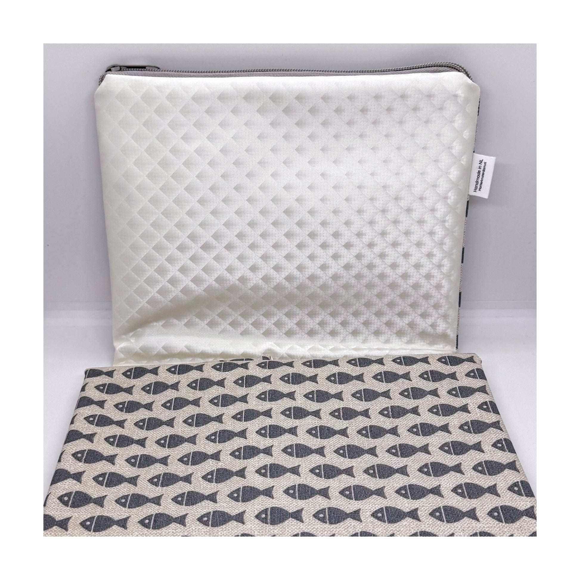 Changing mat with zipper and room for diapers, wipes and loose items.
