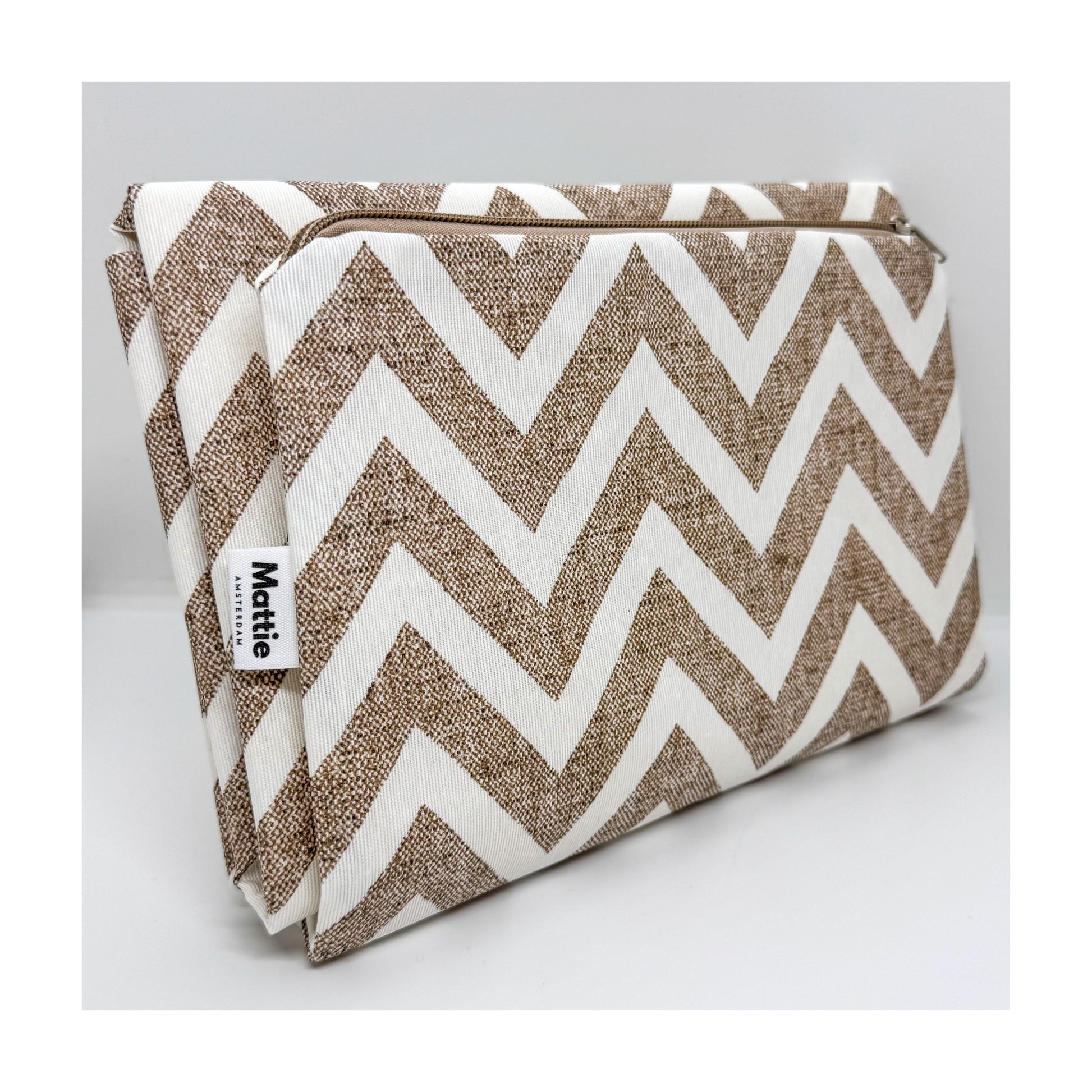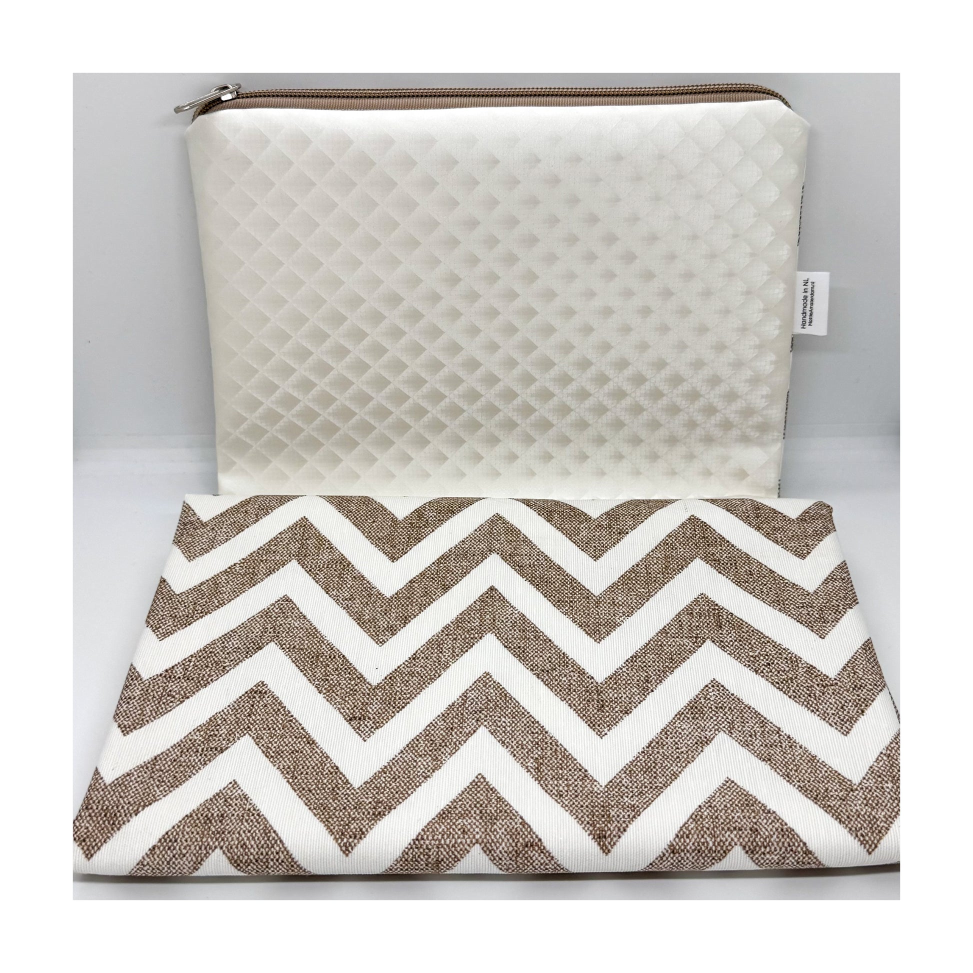 Changing mat with zipper and room for diapers, wipes and loose items.