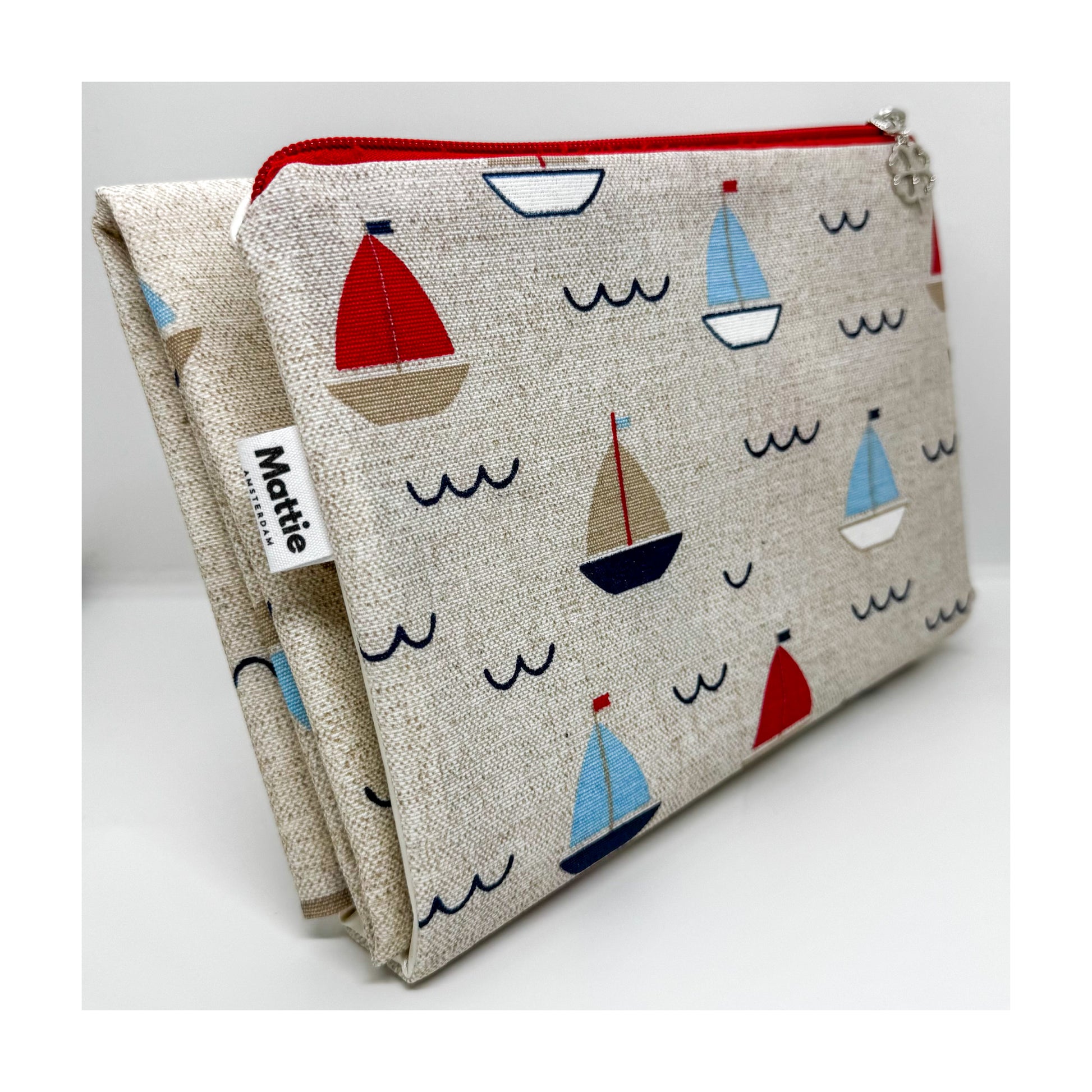 Changing mat with zipper and room for diapers, wipes and loose items.